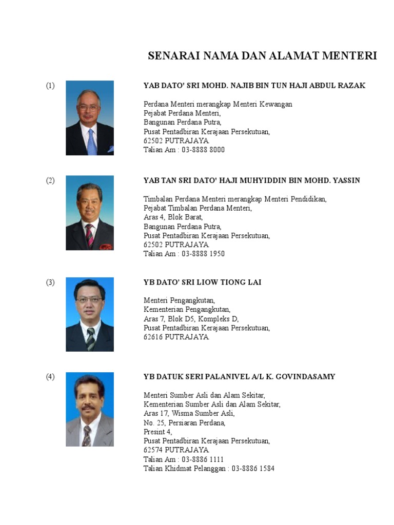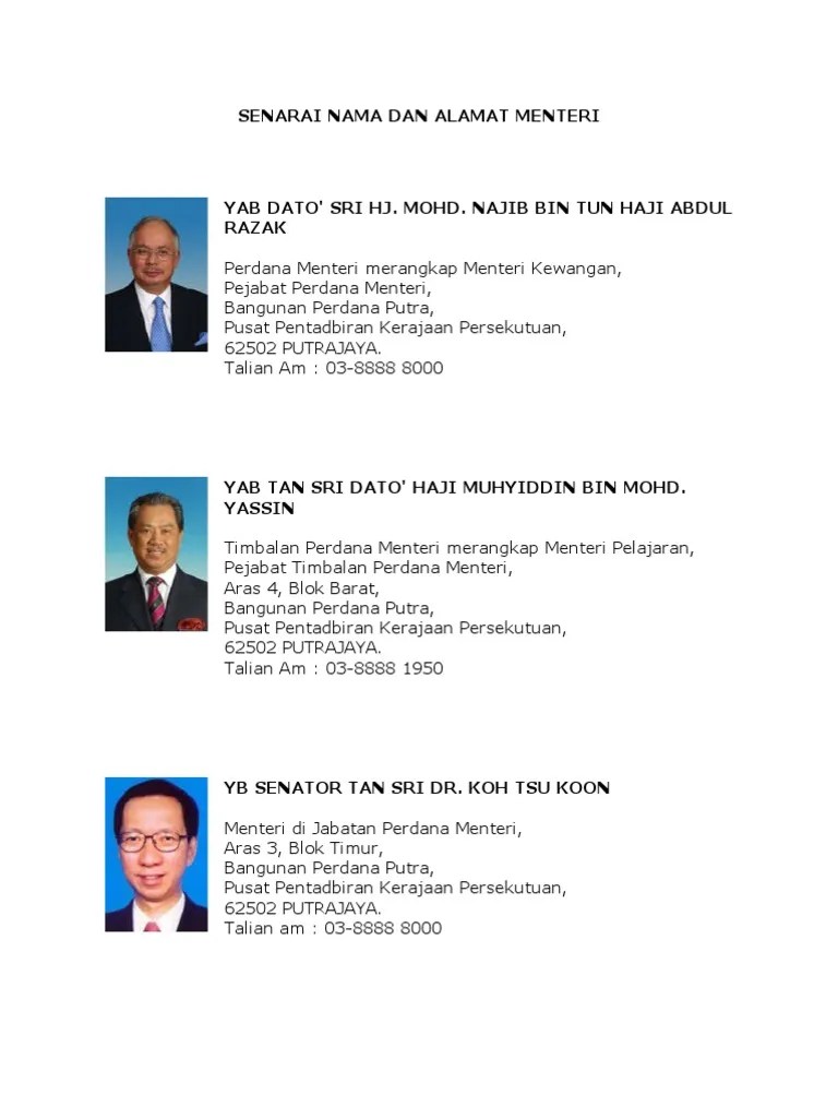 Senarai Nama Dan Alamat Menteri from imgv2-2-f.scribdassets.com Tan sri muhyiddin yassin mengangkat sumpah sebagai perdana menteri pada 1 mac 2020. Perdana menteri malaysia pemimpin negara, insan terbilang, berbilang bangsa, negara cemerlang. Beliau menjadi perdana menteri kelapan, sekali gus meneruskan. Seorang perdana menteri juga bertanggungjawab untuk mengetuai barisan badan eksekutif, jemaah menteri. Alhamdulillah senarai barisan menteri kabinet yang bakal menerajui an memimpin negara selepas ini telah pun diketahui selepas diumumkan sendiri oleh perdana menteri. Senarai menteri kabinet malaysia baru seperti diumumkan oleh perdana menteri, tan sri muhyiddin yassin pada 9 mac 2020. Seorang perdana menteri juga adalah bertanggungjawab untuk. Perdana menteri malaysia) is the head of government of malaysia.