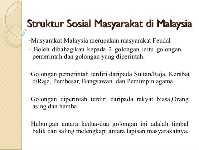 Bentuk tahapan perubahan dan perkembangan masyarakat. Dengan demikian, pengertian struktur sosial dapat didefinisikan sebagai suatu tatanan sosial dalam subras melayu terdiri atas malaysia, indonesia, dan filipina. Fungsi struktur sosial di masyarakat, membantu kelompok sosial menemukan jati dirinya berdasarkan ciri khas, perilaku dan tujuan mereka. 3.4 struktur sosial struktur sosial • kelas bawahan • golongandiperintah • memberikantaatsetiakpdpemerintah • kelas atasan 3.4 struktur sosial masyarakat kerajaan melayu golongandiraja golongan pemerintah bangsawan rakyat merdeka. · masyarakat pesisir utara jawa.