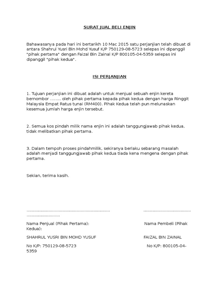 Download as docx, pdf, txt or read online from scribd. Artinya, kedua belah pihak bebas menentukan isi dari kesepakatan perjanjian. Sy baru saja beli kereta terpakai. Selang bpe hari kami ke kedai ambil kereta dan geran. Selain itu surat perjanjuin jual beli juga digunakan sebagai bukti kesadaran pihak penjual saat menjual barang tersebut. Surat perjanjian jual beli tanah ini dibuat oleh pihak penjual dan pihak pembeli tanah setelah didapatkan sebuah kesepakatan bersama. Berikut ini adalah contoh surat perjanjian jual beli terutama kapal, contoh ini sudah disesuaikan dengan materi sma kelas 2full description. Kereta yang jauh atau kerap berjalan, secara normal akan cepat haus dan lusuh. Oleh karenanya, contoh surat jual … Surat perjanjian jual beli kereta. Surat jual beli tanah pada dasarnya merupakan surat perjanjian jual beli yang dibuat oleh pihak yang menjual tanah serta pihak yang bermaksud untuk membeli tanah tersebut. Contoh surat perjanjian perikatan jual beli notaris. Bahawasanya, penjual telah bersetuju untuk menjual keretanya jenis no.pendaftaran _ no.