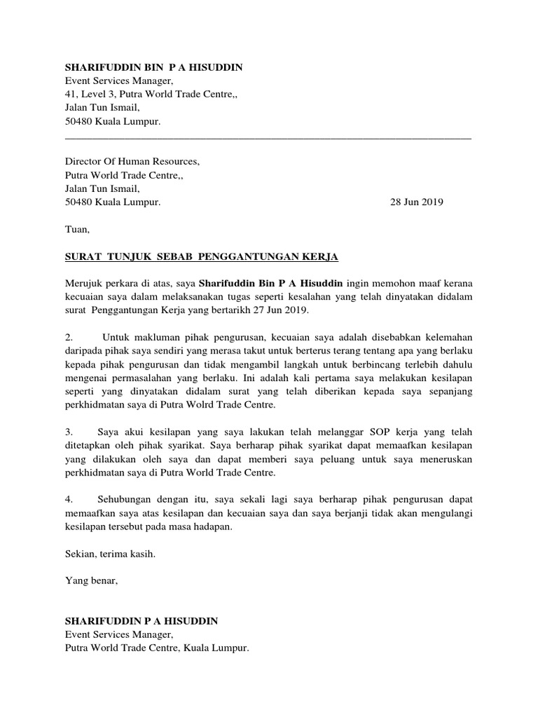 Selain contoh surat di atas anda juga boleh rujuk contoh surat berhenti kerja 30 hari ~ download template percuma ini. Berikut adalah contoh format surat tunjuk sebab yang mudah dan terbaik dan boleh dijadikan panduan kepada mereka yang perlu menyediakan surat ini untuk menjawab surat majikan Surat ini sering digunakan jika anda mempunyai masalah seperti tidak. Contoh surat tunjuk sebab majikan dan pekerja | ok, untuk kali ini, admin akan ajarkan anda cara menjawab surat tunjuk sebab (show cause letter) yang diberikan oleh majikan kepada anda sebagai pekerja yang mungkin korang ada melakukan salah laku atau seumpamanya. 0 ratings0% found this document useful (0 votes).